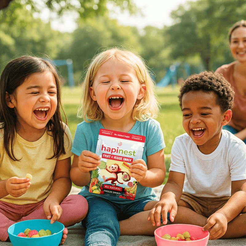 That’s why we expanded into snacks, bringing the same heart and playfulness to food. Today, our freeze-dried fruit & veggie bites are made with 100% real ingredients, no added sugar, and no junk—just colorful, delicious snacks that nourish bodies and fuel joy. From playroom to lunchbox, Hapinest helps families thrive.