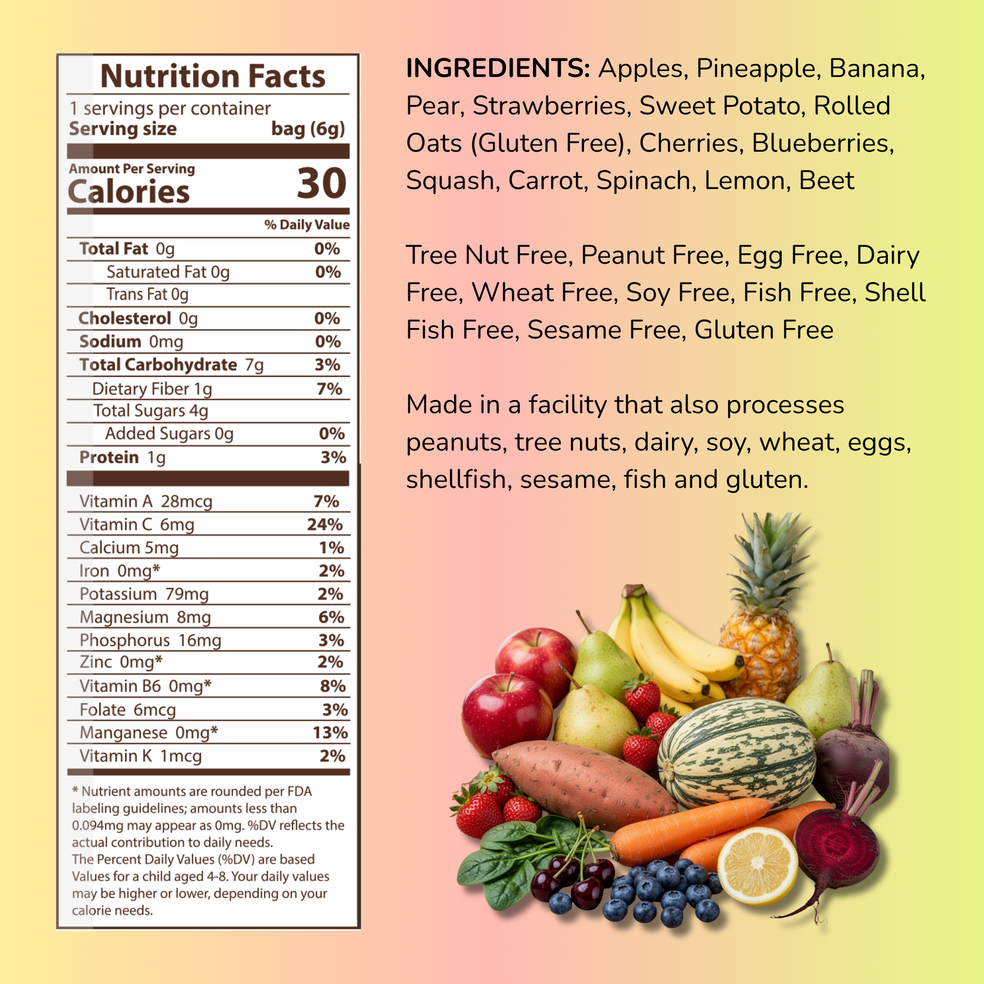Apples, Pineapple, Banana, Pear, Strawberries, Sweet Potato, Rolled Oats (Gluten Free), Cherries, Blueberries, Squash, Carrot, Spinach, Lemon, Beet